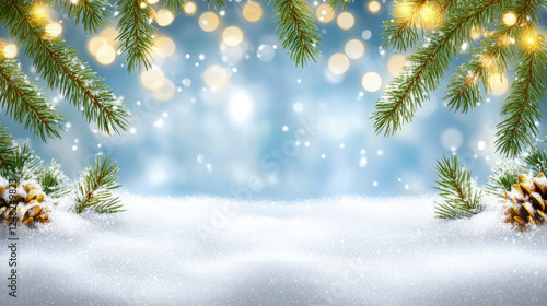 Winter Holiday Festive Scene: Holiday Background for Print, Card, or Poster, Featuring Snow, Pine Branches, and Bokeh Lights