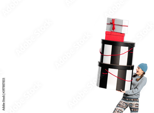 winter holidays presents concept, Caucasian girl holding huge giant present box