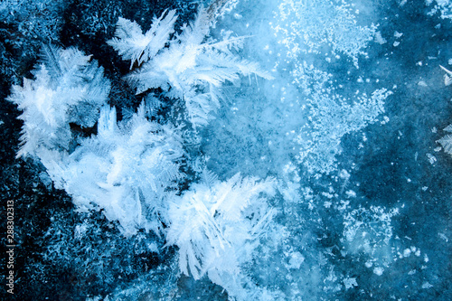 Winter ice background with snow and snowflakes. Natural texture of frozen water. New Year and Christmas card.