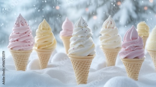 Winter ice cream in various colors and flavors on a winter background with snowflakes falling from the sky, a refreshing drink concept