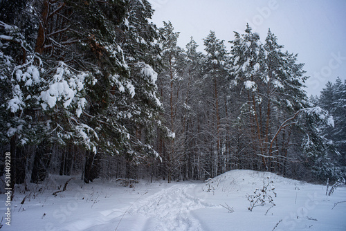 Winter in a spruce forest, spruces covered with white fluffy snow. Selective focus.