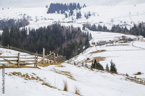 Winter landscape in the Carpathian mountains with gutsul culture.