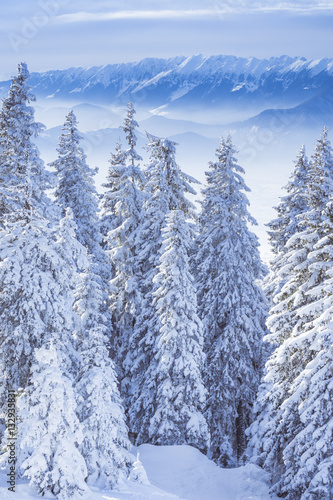 Winter landscape in the mountains with a forests of tall fir trees covered by snow