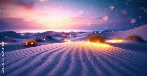 Winter landscape. Snow covered dunes glow under vibrant sunset, distant lights twinkle. Peaceful scene evokes calm beauty.