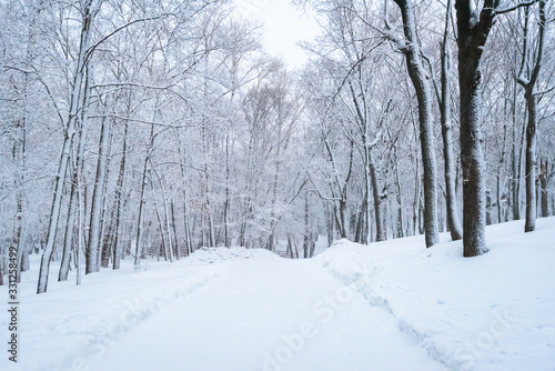 Winter landscape, trees in the forest after a heavy snowfall, road in the forest.