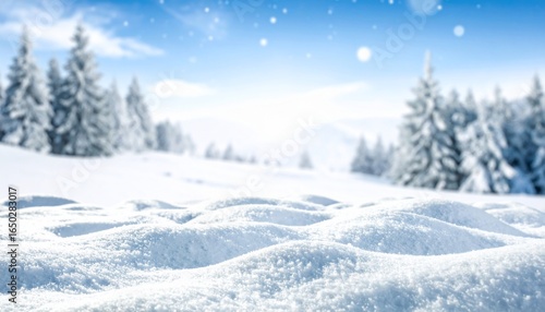 Winter landscape view featuring snow-covered fields and frosty evergreen trees under a bright blue
