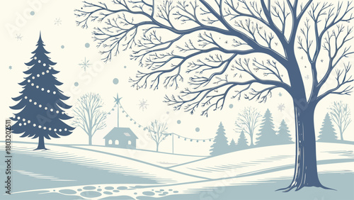 Winter landscape with christmas tree, house, and bare tree branches in a snowy scene illustration