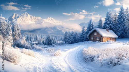 Winter landscape with cozy cabin amidst snow-covered mountains