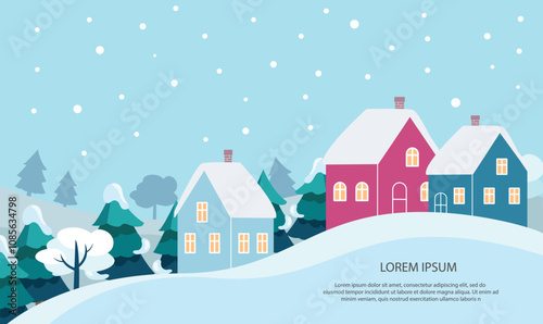 Winter landscape with houses, vector illustration. Banner for Merry Christmas, Happy New Year holidays.