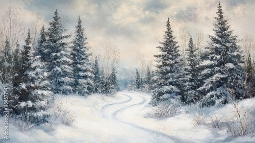 Winter landscape with tall evergreens and a winding trail blanketed in snow