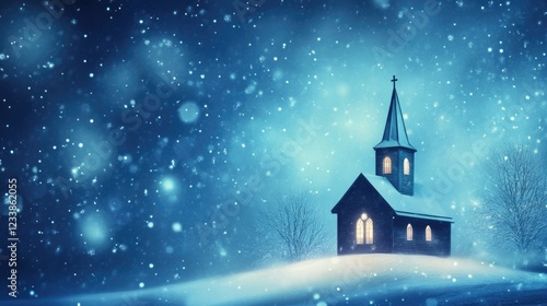 Winter Night Christian Scene with Snowy Church Silhouette and Blue Ambient Lights Featuring Space for Text or Messaging