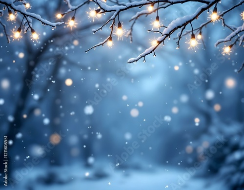 Winter night scene with snow-covered ground, glowing string lights, and softly falling snowflakes against a dark background. Horizontal festive design.