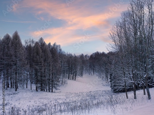 winter panorama landscape with forest, trees covered snow and sunrise. winterly morning of a new day.