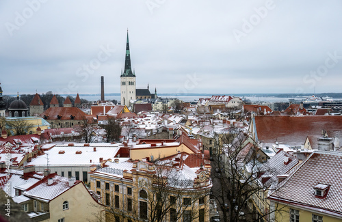 Winter panoramic view of snowy rooftops and St Olaf church in Tallinn old town