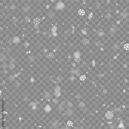 Winter pattern with white snowflakes on transparent backdrop for seasonal, Christmas and New Year decoration.