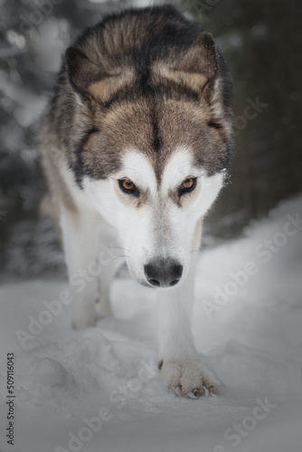 Winter portrait of a dog like a wolf