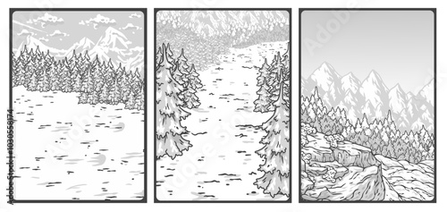 Winter poster set or signs. Snow backdrops or winter background collection. A collection of three illustrations featuring snowy landscapes, perfect for evoking a sense of winter adventure