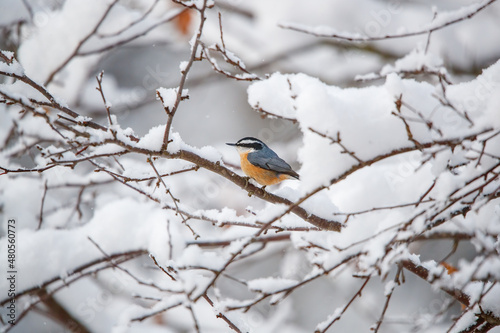 Winter red breasted nuthatch on branch