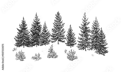 Winter Ridge Scene with Frosted Hemlock Trees, alpine evergreen silhouette, snowy forest clipart, icy woodland engraving, vector illustration, seasonal outdoor scenery, christmas tree