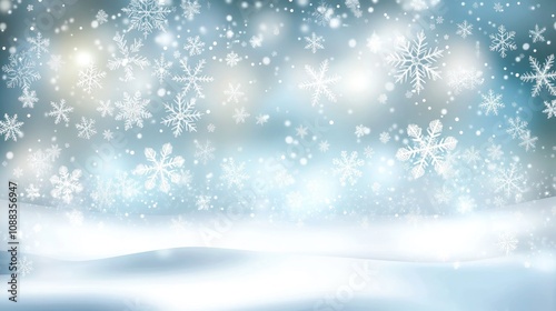 Winter scene with soft blue and silver tones, featuring blurred snowflakes that create a dreamy ambiance and offer ample space for text.