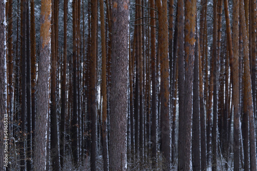 Winter scenery with pine forest covered with white snow. Selective focus.