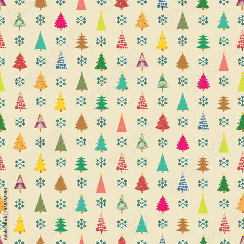 Winter seamless pattern christmas trees decorations, woods. vector and Icon in flat cartoon style. Surface design for textile, fabric, wallpaper, wrapping, gift wrap, paper, scrapbook and packaging.