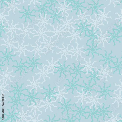 Winter seamless pattern with chaotic snowflakes in different shades of blue color
