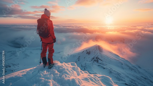 Winter season. A man standing on top of a snow covered hill. Suitable for winter landscapes and outdoor adventure themes