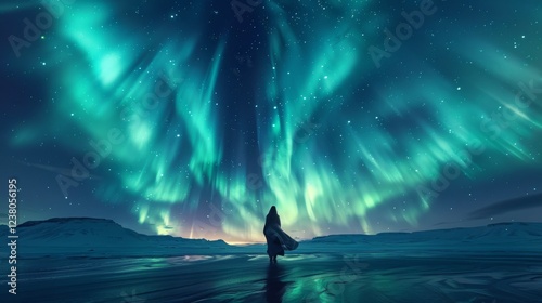 Winter season. A woman in a flowing ethereal gown aurora