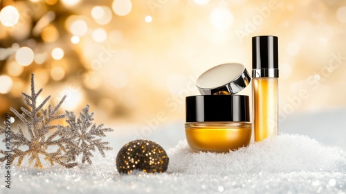 Winter skin care cosmetic products in snow and snowflakes on white background with bokeh lights. Opened face cream jar and hand creme or body lotion tube. Festive banner with copy space for text