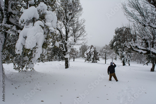 Winter snow mountain cabin panorama. Winter mountain snow forest tree. landscape mountain snow. Winter and cold Winter forest in Algeria, Jijel North Africa, snow covered trees and cold weather. Arabs