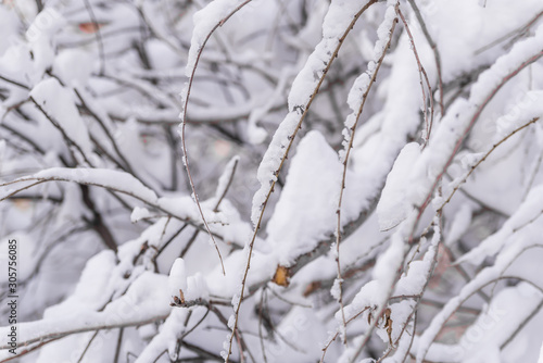 winter, snow on the branches of a tree, patterns Branches of bushes in the snow in winter in cloudy snowy weather.