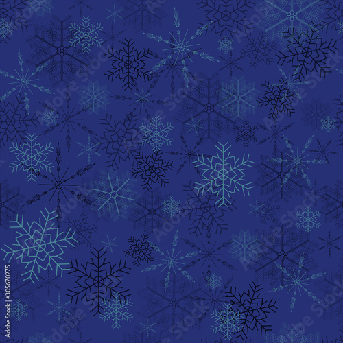 Winter snow pattern, seamless texture with snowflakes on a blue background.
