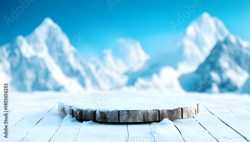 Winter Snow Scene with Snowy Mountains Background and Wooden Stage for Display Mockup and Presentation in Nature