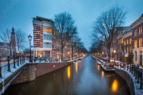 Winter snow view of Dutch canal and old houses in the historic city of Amsterdam during the blue hour, the Netherlands