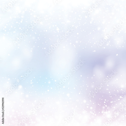 Winter snowfall and snowflakes on light blue background. Xmas and New Year background. Vector