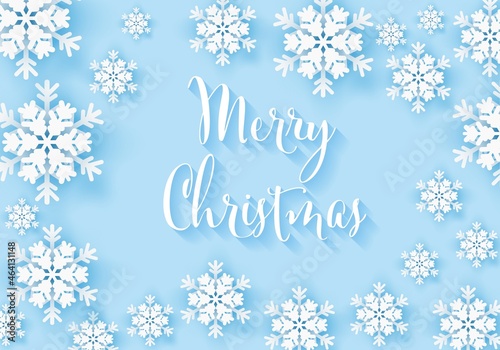 Winter snowflake greeting banner with blue background. Merry Christmas white snow invitation design card. Wintertime paper poster template for christmas holiday. Vector illustration