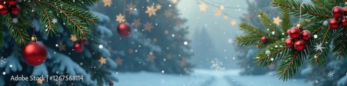 Winter snowflakes and holly branches adorned with gold ornaments suspended in mid-air , gold ornaments, Christmas elements