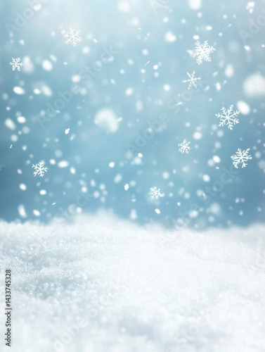 Winter snowflakes falling on snow-covered ground with soft blue background and bokeh effect, creating a peaceful cold weather winter scene and festive holiday atmosphere