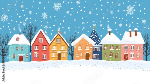 Winter snowy landscape. Christmas house minimal background, country or cute village in forest. Flat street cold weather and snow illustration