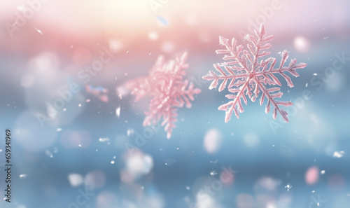 Winter snowy pastel wallpaper. Pink soft pastel gradient background with snowflakes. Cold and vivid illustration copy space