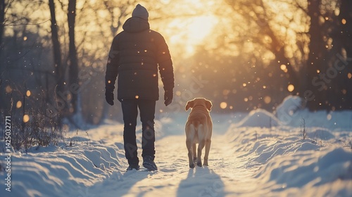 Winter Solitude: Man and Dog Walking Snowy Path at Sunset