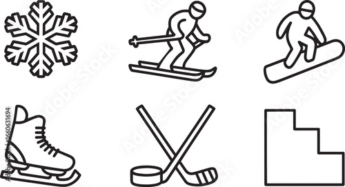 Winter Sports Icons Set Snowflake Skier Snowboarder Ice Skate Hockey Sticks Steps Outline Style