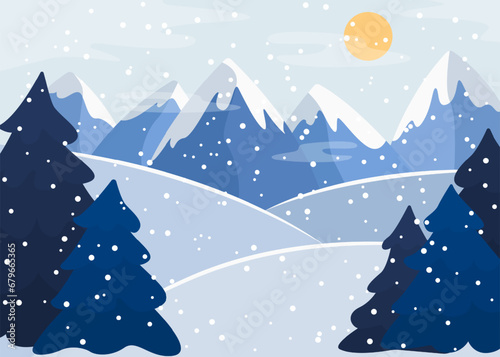Winter sunny landscape illustration. Snow-capped mountains and Christmas trees. Seasonal background