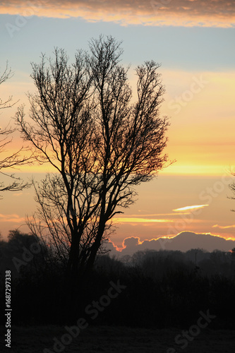 Winter sunrise with bare trees, Gosfield, Braintree, Essex, UK