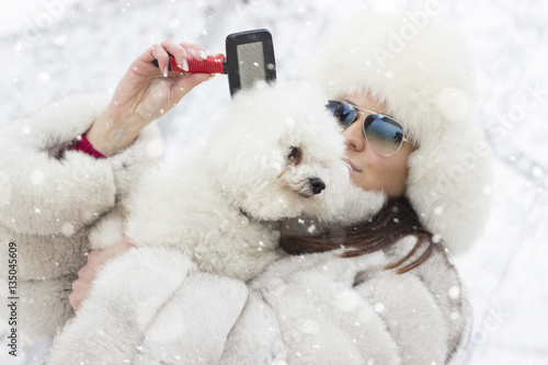 Winter time fun. Woman wearing fur hat and winter coat holding her dog while she is grooming him. Brushing the dog in the winter time. Snowing outside.