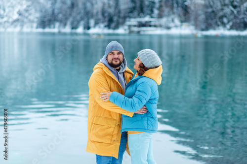 winter travel across Europe. view of the alpine lake with snow. portrait of an adult couple of enamored travelers on the shore of a high-mountain lake.