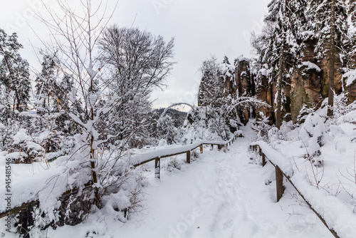 Winter view of a path in Prachovske skaly rocks in Cesky raj (Czech Paradise) region, Czech Republic