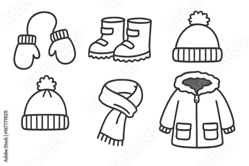 Winter Wardrobe Doodles. Children’s winter wardrobe doodle set: hand drawn icons for mittens, snow boots, beanie hats, scarves,