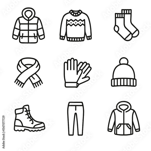 Winter Wardrobe Icons. Outline icon set of winter wardrobe preparation: insulated coat, wool sweater, thermal socks, knitted scarf